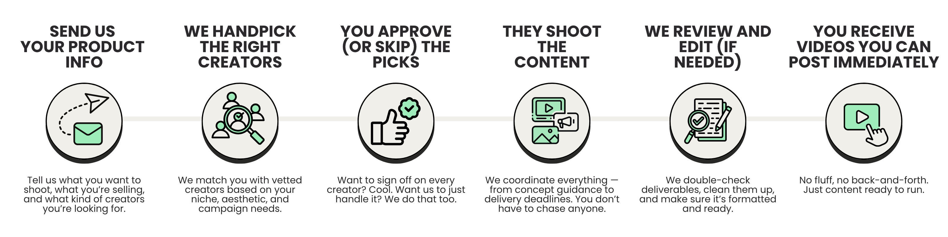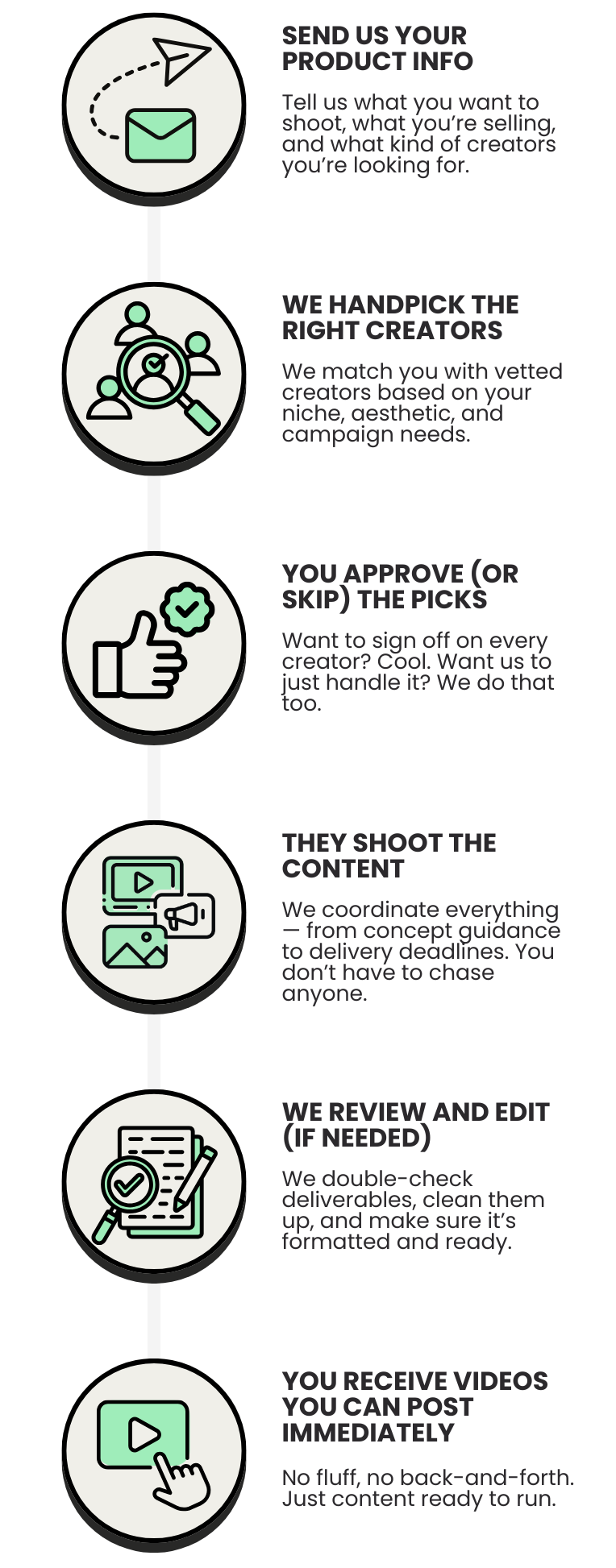 We work with a private list of over 10,000~ vetted creators. Every creator is matched based on your brand’s aesthetic, tone, and needs: no generic fits, no guessing. You can approve the creators, or just let us handle it.